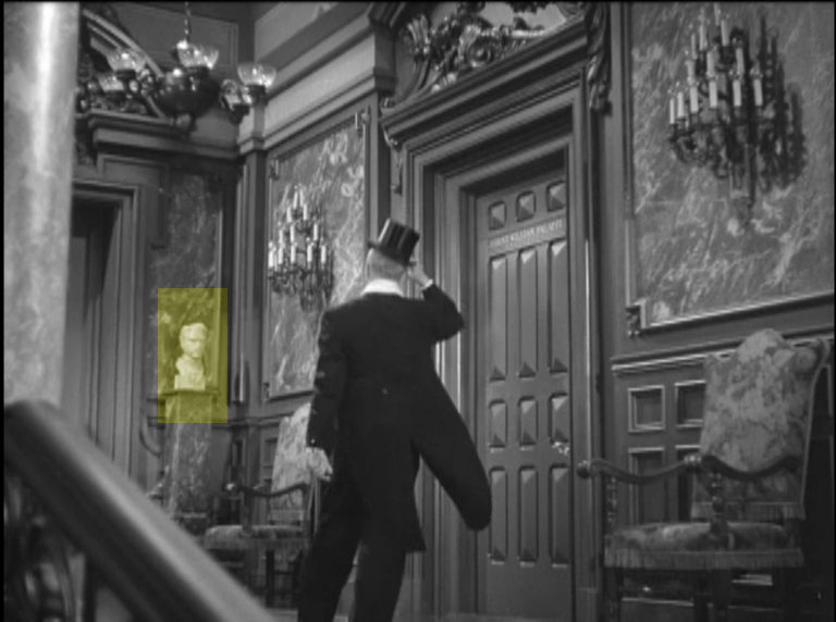 The bust on the left is one of two that Nelson sculpted for the film I Married an Angel (1942). If you look closely, both busts appear on display—purportedly representing his character’s ancestors—during an early scene when Nelson rushes into the bank. He was also said to have painted the large portraits of his “banker ancestors” that hang on the bank’s walls, although these paintings remain in the background and are somewhat out of focus.