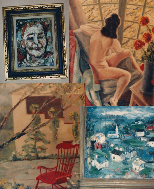 Shown below is a montage of four surviving paintings by Nelson, including an unfinished clown, an unidentified nude, the red rocking chair, and a landscape titled Remembrance of New England. Additional nudes, landscapes and drawings can be found in Mac/Eddy Today Issue #76, as referenced above.