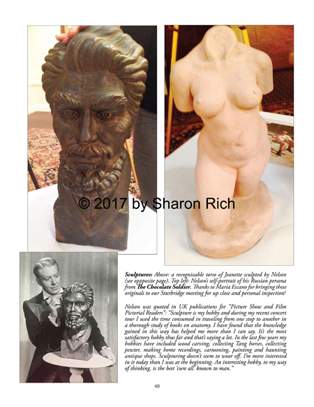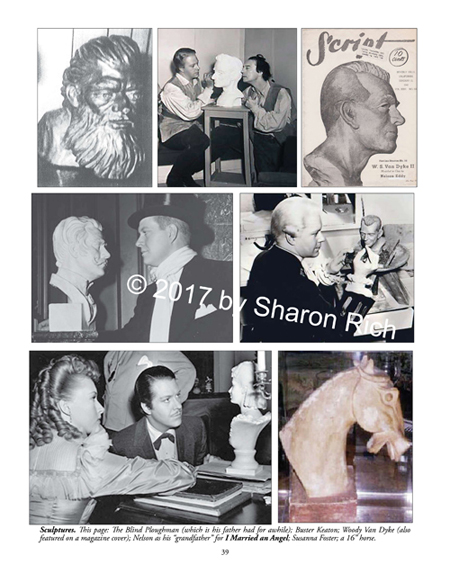 Below left, Nelson on the set of “I Married An Angel” working on the Jeanette bust. The hair was later finished and the entire bust painted in a bronze color, as you can see to the right. (This bust has been enlarged slightly so it is life size and thus a matching pair to the Nelson self-portrait bust below.)